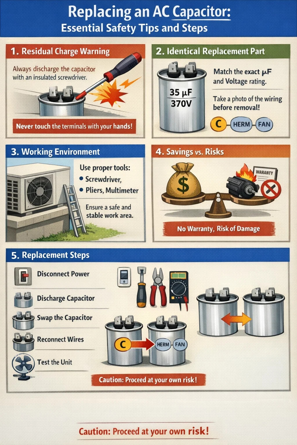 Garantie ongeldig: Als uw airconditioner nog steeds onder de garantie valt, kan het zelf vervangen van de AC-condensator de fabrieksgarantie ongeldig maken.