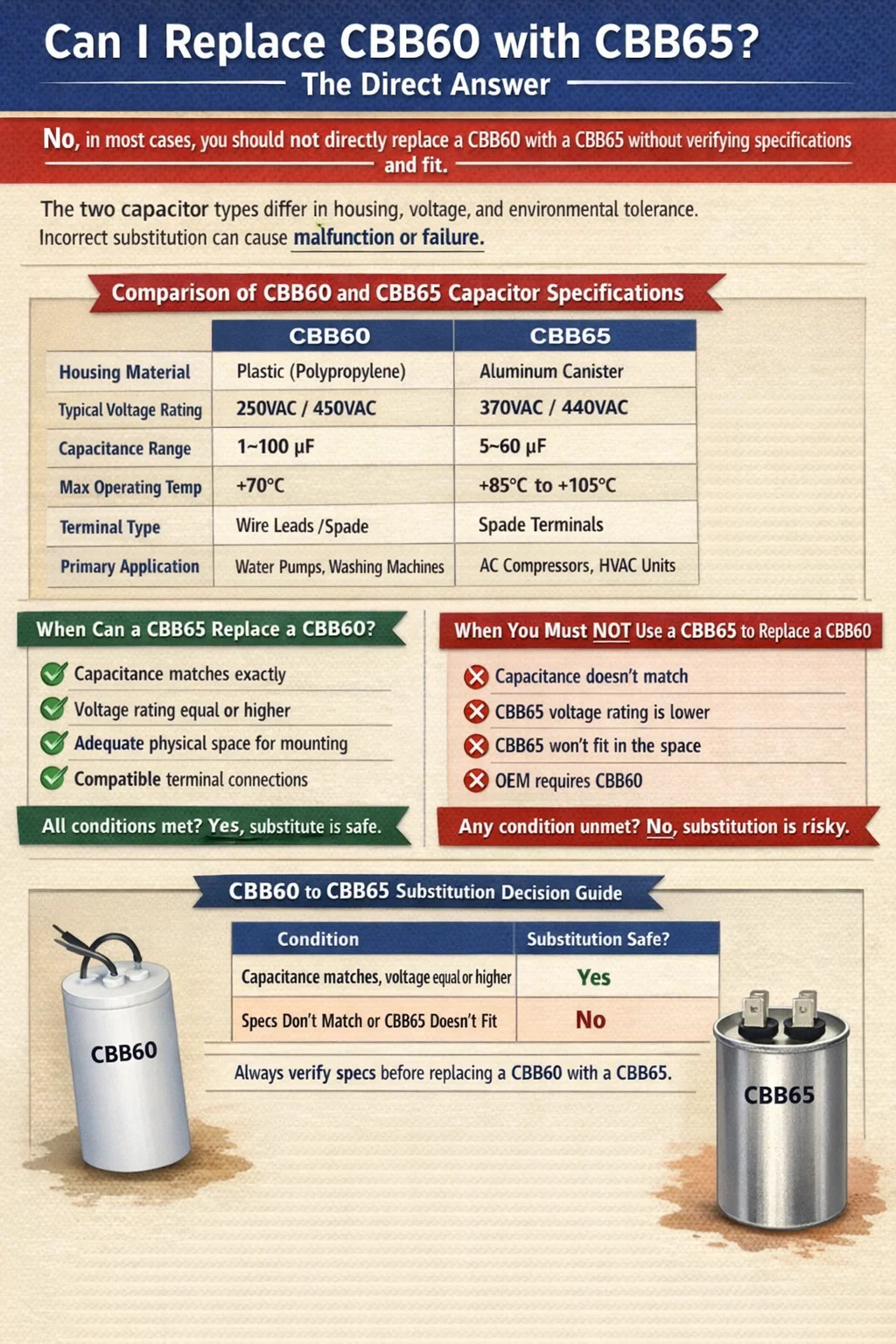 De bottom line: behandel elke condensatorvervanging als een oefening in het matchen van specificaties, en niet als een kortere weg. De CBB60 en CBB65 zijn verschillende tools die zijn gebouwd voor overlappende maar verschillende doeleinden. Wanneer hun specificaties op één lijn liggen en de fysieke installatie compatibel is, kan de CBB65 een perfect geldige – en soms superieure – vervanging zijn voor een CBB60. Wanneer de specificaties uiteenlopen of de fysieke beperkingen de omwisseling onpraktisch maken, zal het forceren van de vervanging problemen veroorzaken die veel duurder zijn om op te lossen dan het aanschaffen van het juiste originele onderdeel.