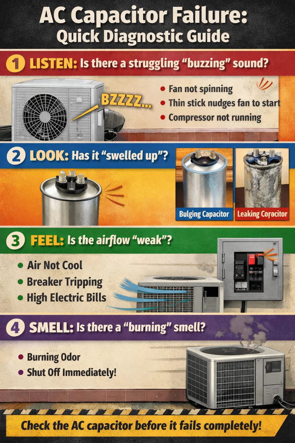 Principe: De AC-condensator is als de hand die de motor een duwtje geeft. Als de condensator kapot is, kan de motor niet zijn volledige kracht uitoefenen en kan hij alleen maar op zijn plaats "worstelen", waardoor een gedempt geluid ontstaat.