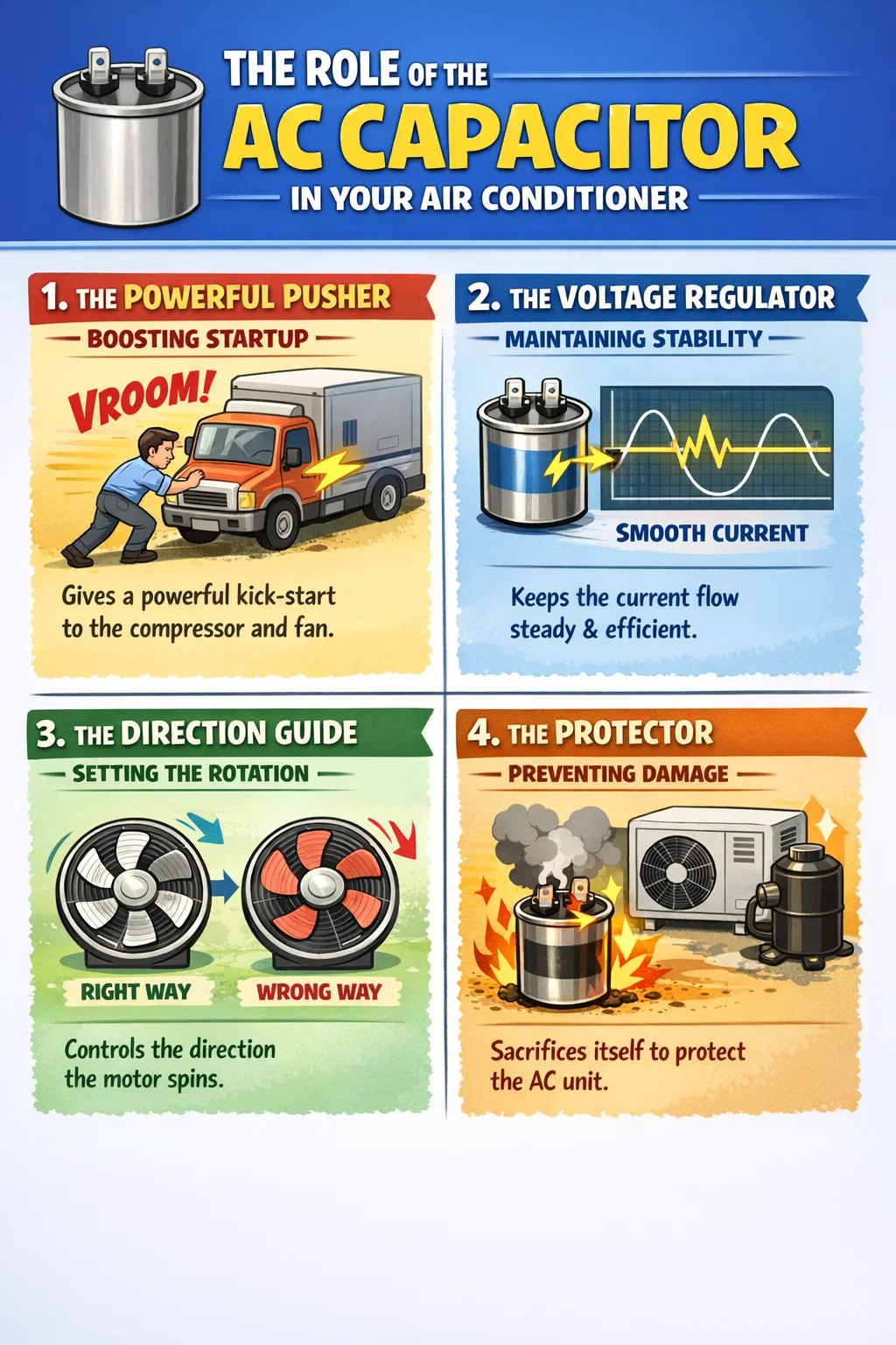 Nadat de airconditioner soepel begint te werken, komt hij niet helemaal tot rust. Op dit punt verandert zijn rol in die van een bedrijfscondensator.