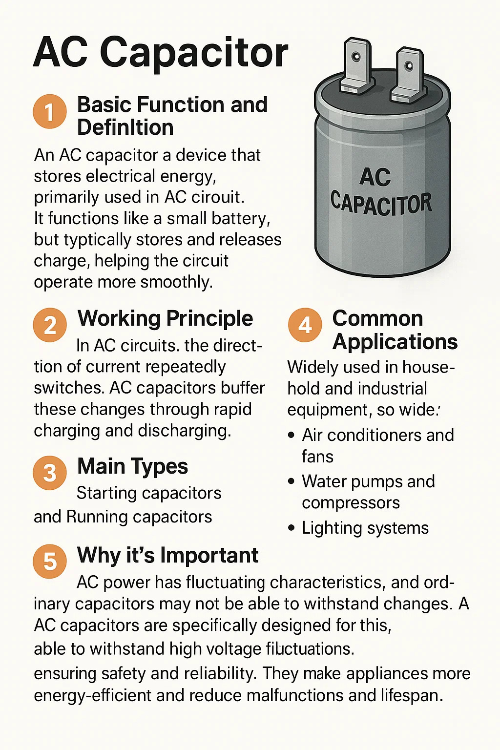 Een AC-condensator is een elektronische component die wordt gebruikt in wisselstroomsystemen (AC), speciaal ontworpen voor het verwerken van wisselstroom. Hieronder vindt u een overzicht van de belangrijkste aspecten ervan, in eenvoudige bewoordingen uitgelegd.